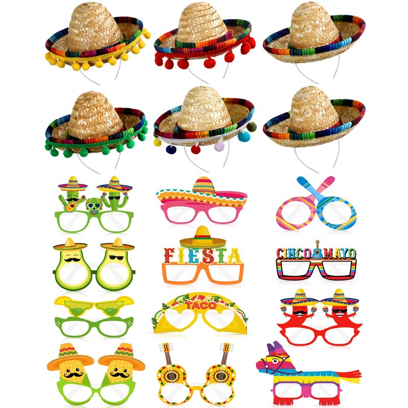 Janinka 18 Pcs Cinco De Mayo Fiesta Party Supplies Straw Sombrero Headbands Paper Eyeglasses, Mexican Theme Party Decor (Classic Style)