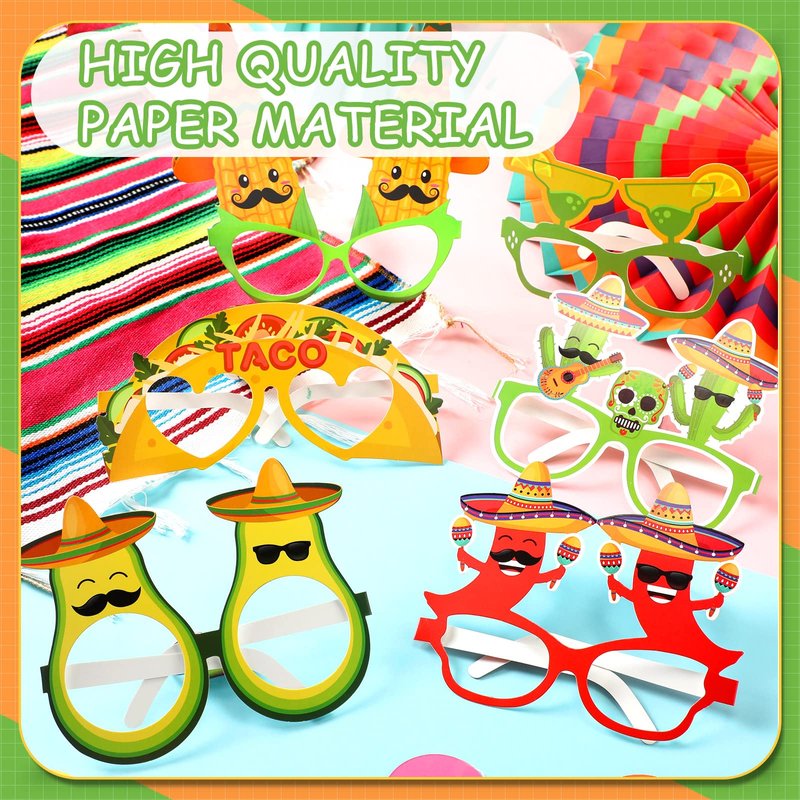 - Interesting Paper Glasses: these 12 fiesta sunglasses feature with different shapes including cactus, chili pepper, pinata, taco, avocado, corn, guitar, sombrero, maraca and Margarita, cute and interesting patterns to enrich your party, ideal for taking photos props and decorations