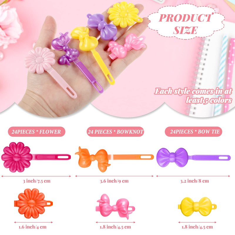 - Beautiful shape: our cartoon design hairpins are designed into 3 shapes, including bows, flowers and butterflies, each shape has 24 pieces, beautiful and charming; The candy colors plus cute shapes will make you more appealing in the crowd
