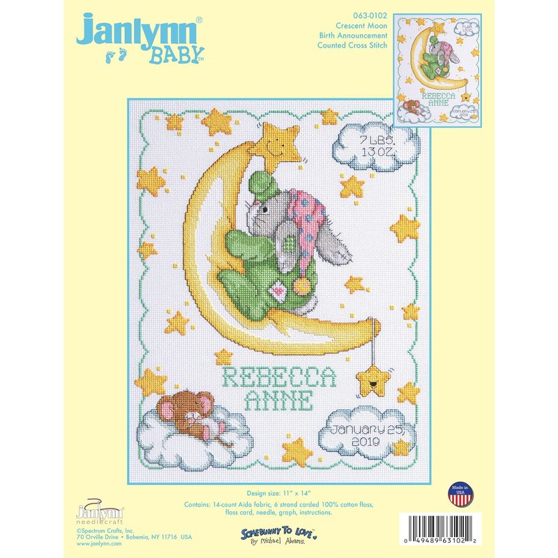 Janlynn Cross Stitch Kit, 14-Inch by 11-Inch, Crescent Moon Birth Announcement, White