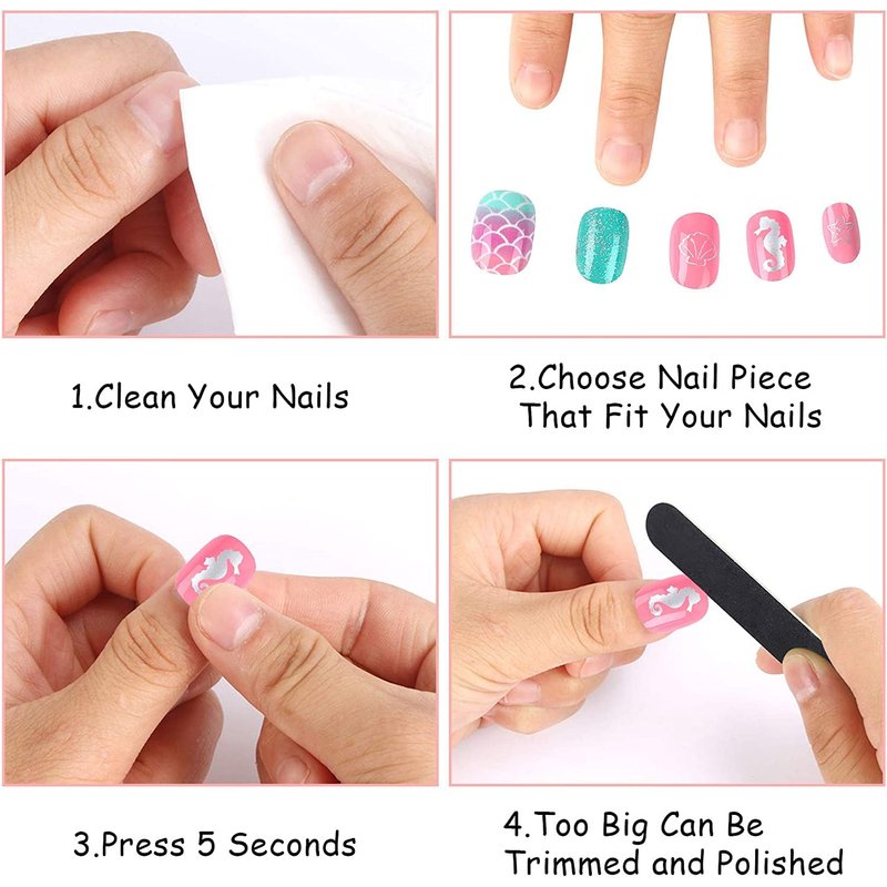 - HOW TO USE - First remove the moisture and oil from the original nails.Then choose the right size to stick on the nails,press for 5 seconds.If the size is too large, you can trim and polish.