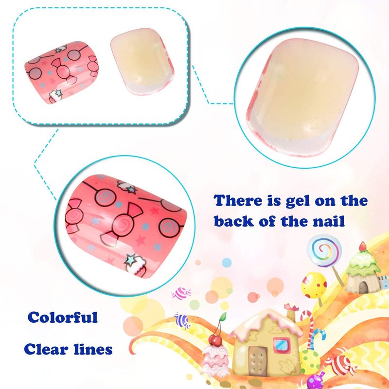 JANYUN 96 Pcs Fake Nails for Kids Pre-glue Full Cover Short False Nails Children Nails Lovely Gift