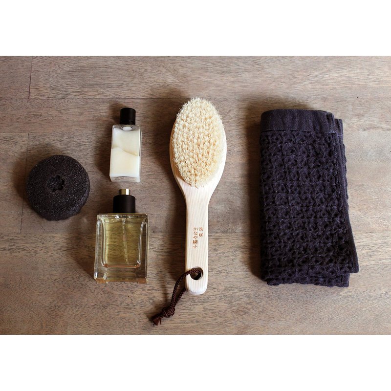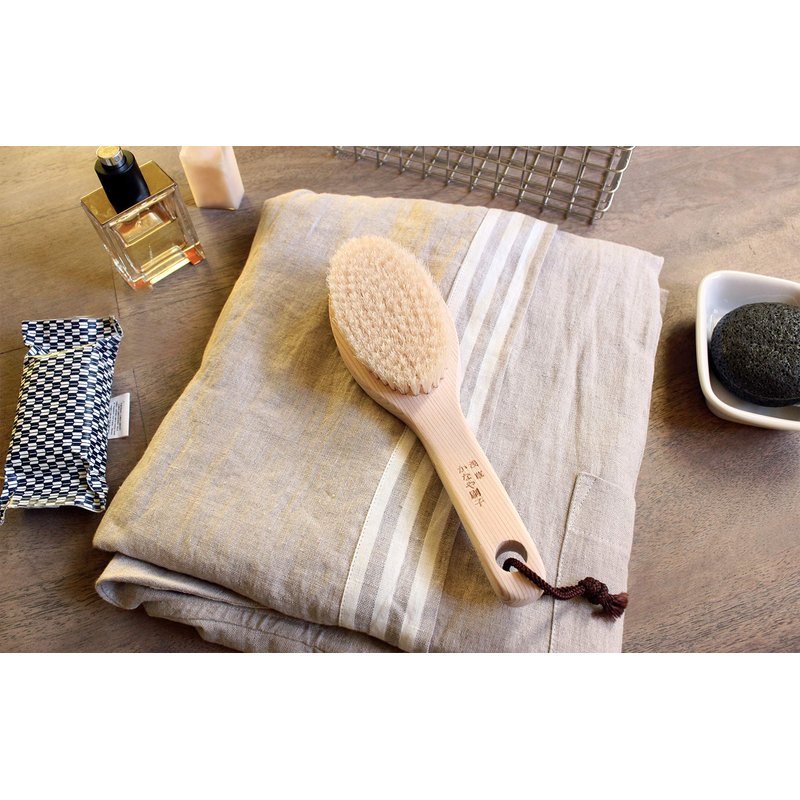 This all-natural body brush will help you have healthy, smooth, flawless, and beautiful skin. Naturally made with no environmentally harmful substances. The brush is crafted with a wooden handle and medium-soft pig hair bristles that are gentle to the skin. The brush helps exfoliate skin and remove dirt and dead skin. Suitable for bath use. A high-quality brush that is absolutely beautiful and eco-friendly. The handle is made from the most abundant type of wood at the time of production like buna (Japanese beech), hinoki, or cherry blossom tree. Care instructions: After use, rinse gently in lukewarm water and dry at room temperature. The brush has a rope loop for hanging. Please note, the color of the bristles and wood handle may vary as it's a natural product. Since 1914, made in Japan.