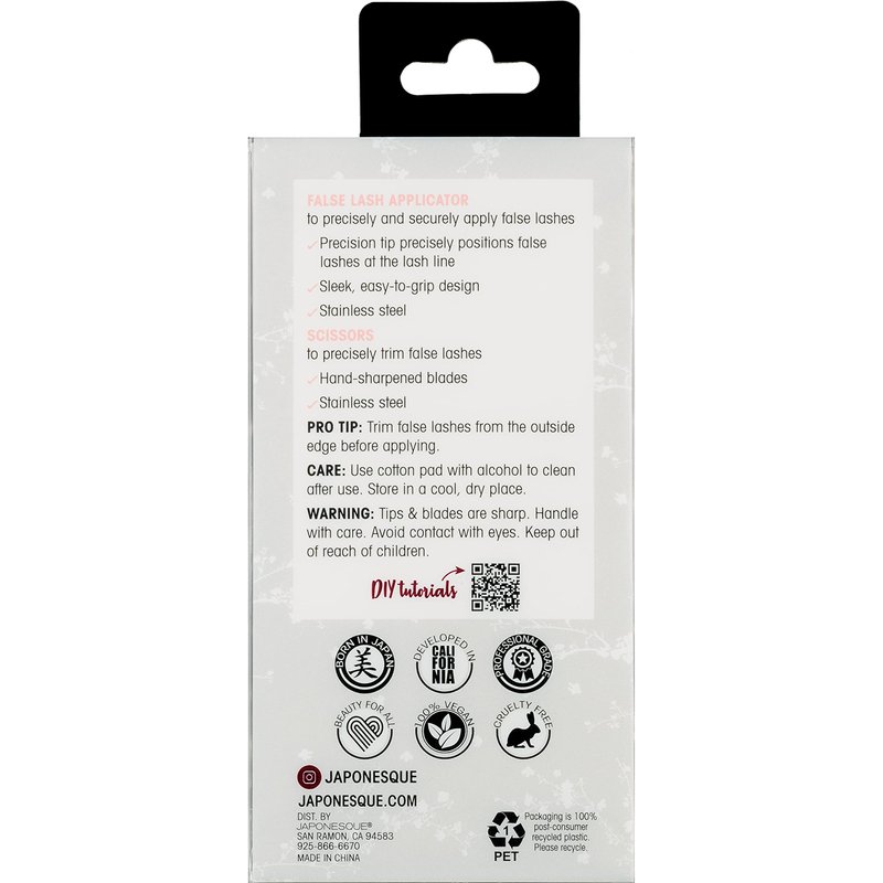 Ready to become a false lash pro? The JAPONESQUE False Lash Applicator Kit is your ticket to flawless lashes every time! With hand-sharpened scissors that let you trim your lashes to perfection and a specially designed tapered-tip applicator that positions your lashes with precision, this is the ultimate two-piece tool set for achieving a natural, seamless look. The flat surface of the applicator helps fuse your false lashes to your natural lashes, ensuring maximum adhesion and wearability. The upward slant and easy-to-grip handle make it super easy to apply false lashes to both eyes. Both pieces are made of high quality stainless steel so you can easily keep your tools clean and ready to take your lash game to the next level. Get ready to turn heads with stunning, voluminous lashes!