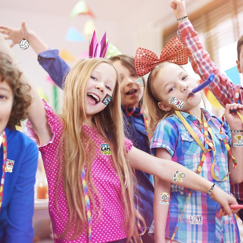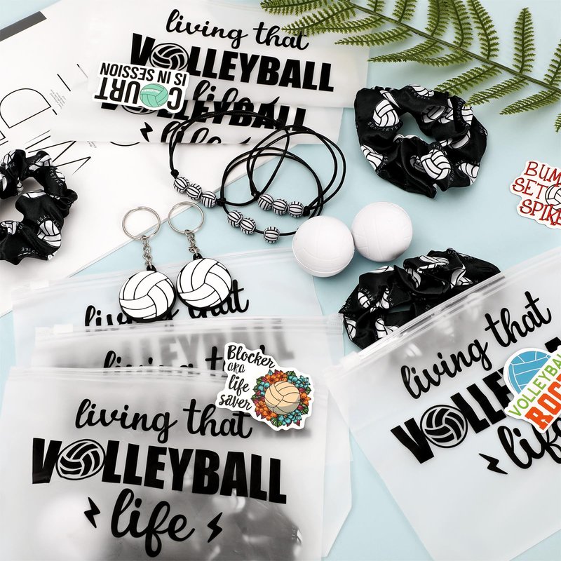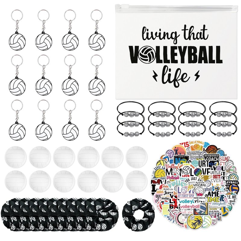 - VOLLEYBALL THEME DESIGN: The keychains, bracelets, hair scrunchies, stress ball, cosmetic bags and stickers are all designed with classic volleyball elements and words. A variety of styles you can choose to decorate your items, make a big splash at your volleyball party and ideal for volleyball fan.