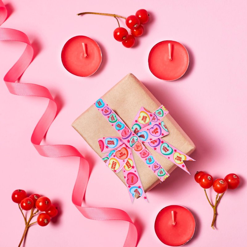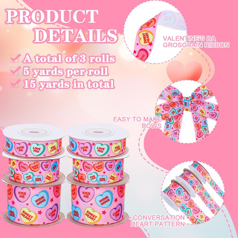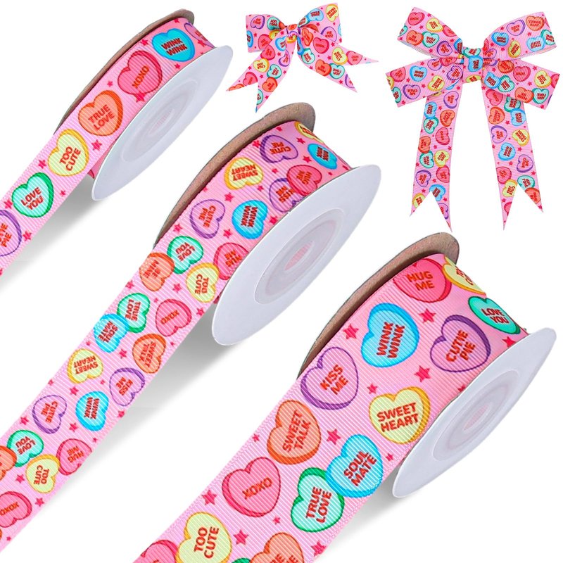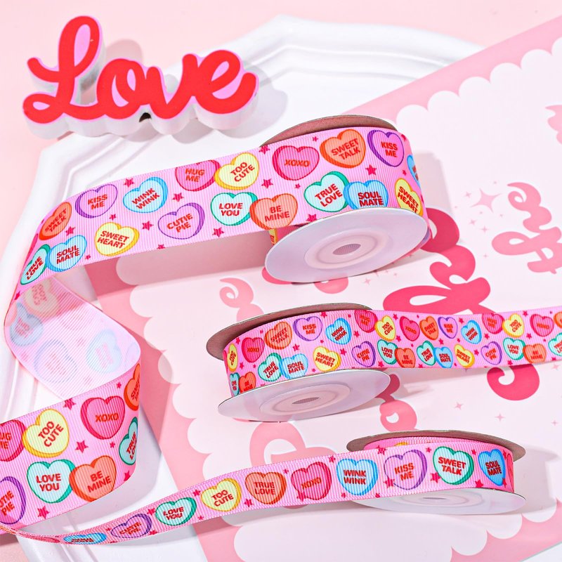 - CONVERSATION HEART GROSGRAIN RIBBON: Our ribbon rolls are printed with colorful hearts and sweet and romantic words on a pink background, in line with Valentine’s Day theme, which can meet your holiday decorative needs.