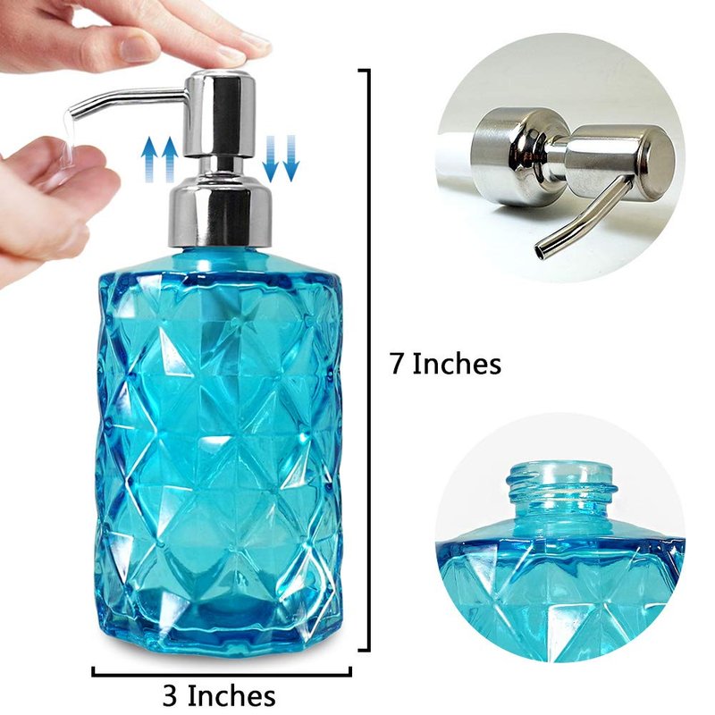 About the ProductJASAI 12 OZ Soap Dispenser Bathroom(Clear Blue) 1.Beautiful and Diamond Design Soap Dispenser, made of high quality glass.2.Durable, premium material construction with a 304 stainless steel soap reservoir. 3.Suitable for hand soap, dish soap shampoo,body cleanser or lotion,etc. 4.Great for bathroom, Kitchen, the office toilet, etc. 5.Perfect gift idea. Specification: Type: Bathroom Soap DispenserMaterial:High Quality Glass Color: BlueSize: 7.5 cm (W) X 18 cm (H) Capacity: 12 oz Package: 1 X Soap / Lotion Dispenser rust proof 304 stainless steel pump soap dispenser (Blue) USING TIPS DO NOT RECOMMENDED The Use Of Strong Cleaning Products During Cleansing.This Glass Bottle Contains Environmental Friendly Color Coating. RECOMMENDED To Rinse With Water Or With Neutral Wash Products And Wipe With Cloth.