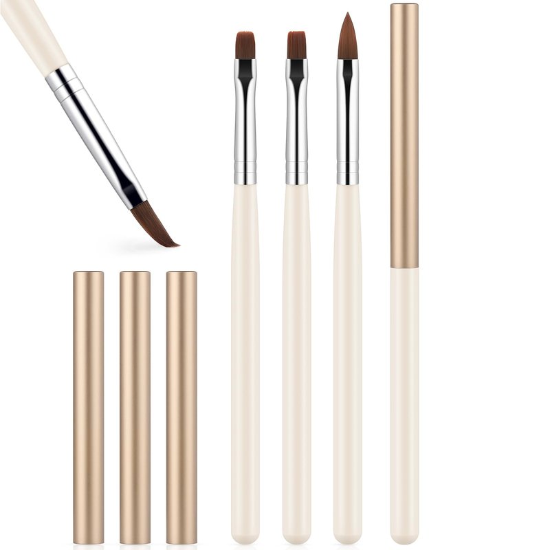 Each brush has a white wooden handle and a golden aluminum alloy cap. The bristles are made of dark brown nylon bristles and have a flat shape. This design allows the brush head to better fit the nail surface, thereby achieving an even coloring effect.