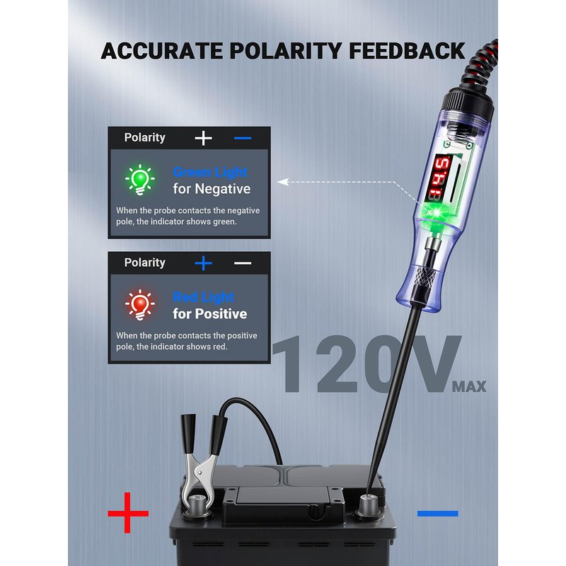 - SMART DUAL-COLOR POLARITY INDICATOR: This LED voltage tester instantly shows polarity with bright colors, even in dark garages or direct sunlight. Color-coded polarity indicators help identify positive and negative poles instantly, and the bright digital display shows you the voltage at a glance!