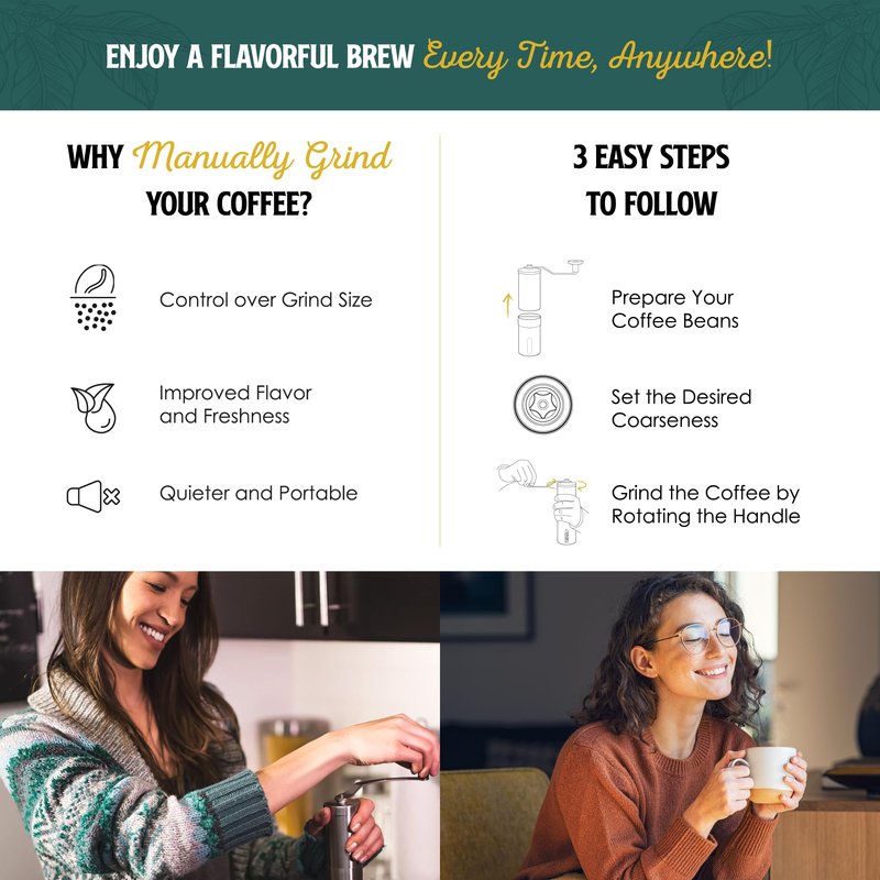 - THE BEST WAY TO START YOUR DAY ― This manual coffee bean grinder is equipped with a professional grade ceramic conical burr for an incredibly consistent coffee grind that heightens flavors of the most exquisite beans in the world. Smell the fresh aroma of fresh ground coffee as you brew them on your espresso machine, drip coffee, French Press, or pour over coffee maker!