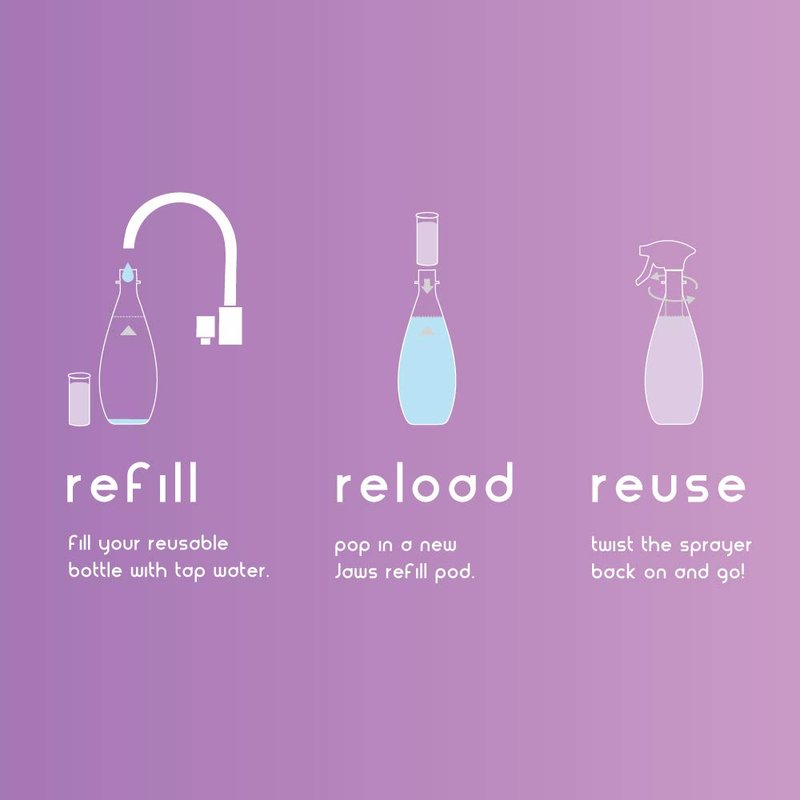 - JUST ADD WATER: Fill the JAWS Reusable Bottle (sold separately) with water, insert the JAWS Refill Pod and apply the trigger sprayer to release concentrate.
