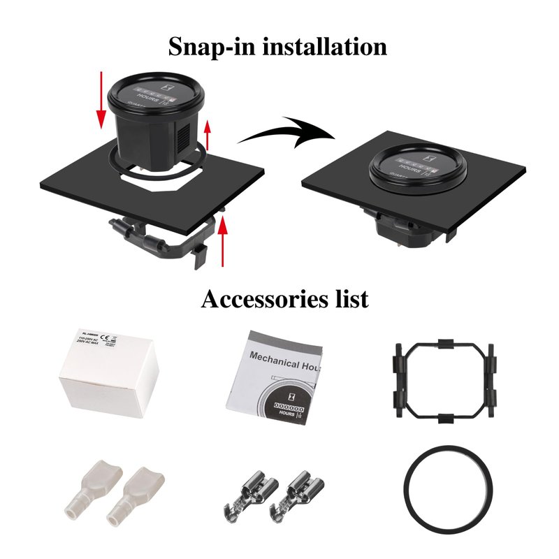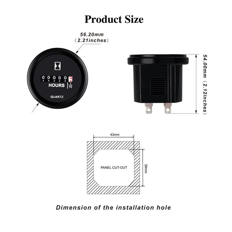 Jayron JR-HM009 Snap-in design, Mechanical timing, automatic accumulate reading, suitable for AC 110-220V voltage equipment, can be used for fork lifts,floor care equipment, and most other battery powered equipment.