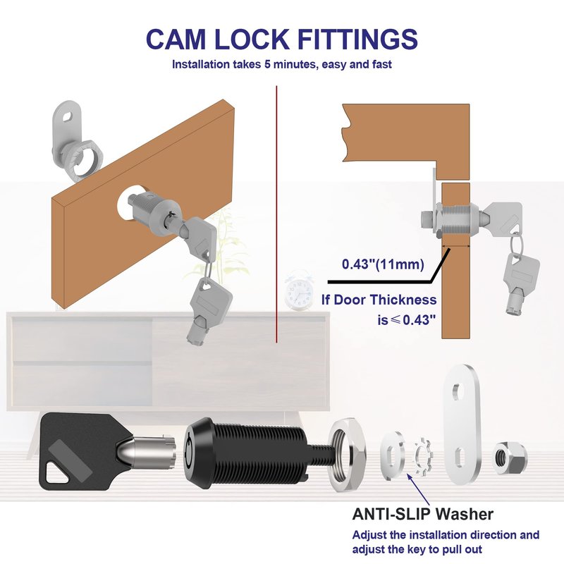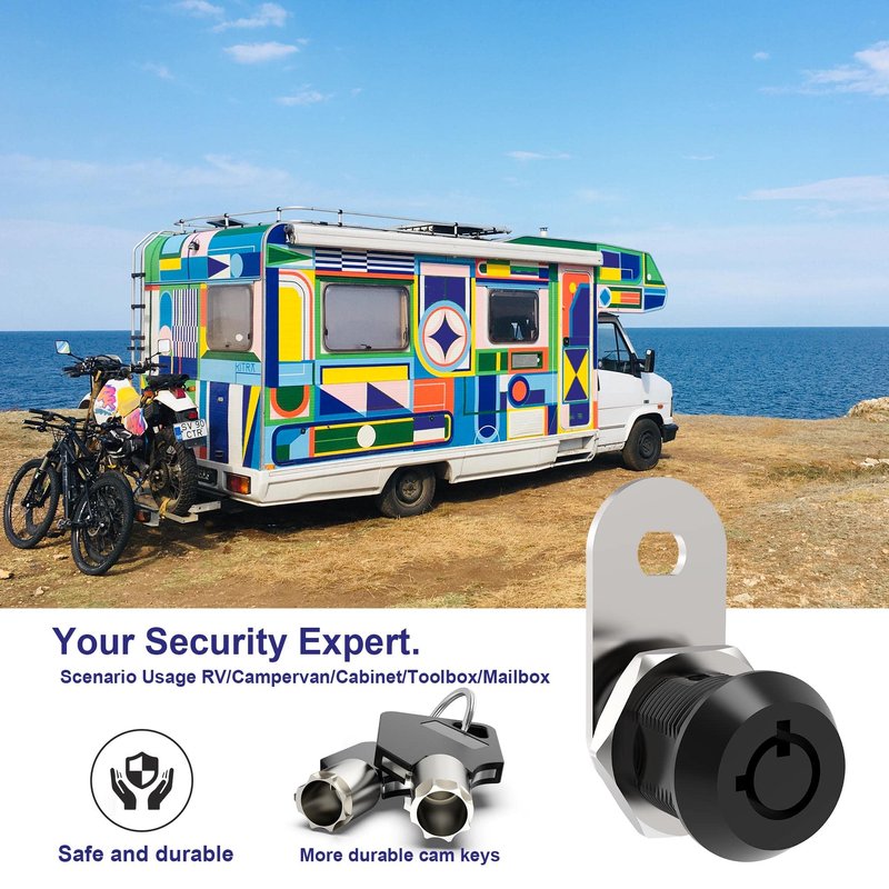 - RV Cam Lock Size: The File Cabinet Lock is a standard size cam lock with a 3/4" diameter and 5/8" length that is compatible with panels ≤ 0.48"(12.19mm) thick. Mailbox lock replacement lock, it is suitable for drawer, cabinet, mailbox, camper or RV storage door toolbox. *Please refer to the dimensional chart (Figure 2) and compare with your needs before purchasing*