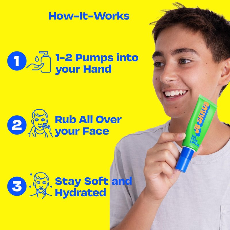 Unlock youthful radiance with JB SKRUB Face Lotion, crafted specifically for the unique needs of kids, tweens, and teens. Our face moisturizer provides essential hydration while balancing and protecting young, changing skin. Perfect for Young Skin: Tailored for kids aged 8–9 and teens aged 10–12, this non-comedogenic face moisturizer is ideal for daily use. It keeps skin hydrated by preventing dryness and controlling oiliness without clogging pores. Hydration Hero: Infused with Aloe Vera, Chia Seed, and Willowherb, our daily face moisturizer deeply hydrates and regulates oil production. It suits both dry and oily skin, making it a versatile addition to any skincare regimen. Acne Prevention: Specifically formulated as a face moisturizer for acne-prone skin, it soothes and calms while maintaining the skin's natural barrier. This ensures clear, vibrant skin, which is essential for teen skincare routines. Digital Defense: Protect against blue light with Chlorella vulgaris. Our advanced formula shields against digital stress, ensuring resilient and youthful skin. Lightweight Luxury: Experience the fast-absorbing, feather-light texture of our gel-lotion hybrid. It leaves no greasy residue, making it the perfect choice for oily skin and providing a smooth, matte finish. Fragrance-Free Comfort: Enjoy the simplicity of our fragrance-free formula, which is suitable for sensitive skin. It delivers unmatched hydration without irritating scents, allowing your natural confidence to shine. Teen and Tween Skincare Essential: Vital in any tween or teen skincare routine, this daily face moisturizer keeps skin soft, hydrated, and healthy, promoting a clear and confident complexion. Discover JB SKRUB's boys Face Lotion, your solution for balanced, hydrated, and radiant skin. Perfect for all young skin types, it’s the ultimate choice in skin care for teens 10-12 who prioritize clear, healthy skin.