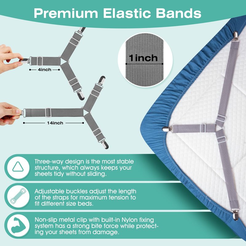 - ✅【Keep Your Bed Sheets in Place】I think you've had enough of crumpled sheets after getting up, and so irritated with the bed sheets sliding off daily, with this three-way design of the sheet straps will keep your mattress sheet tidy all the time and completely get rid of the headache of making up your sheets every day!