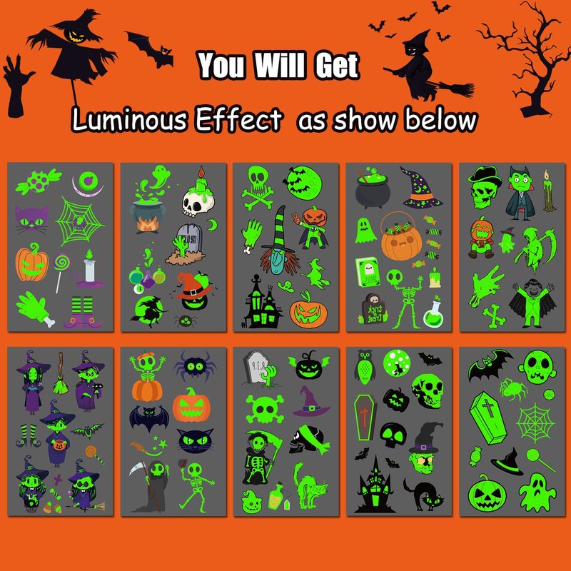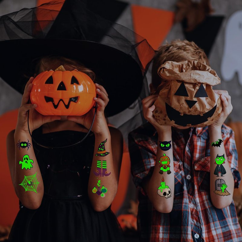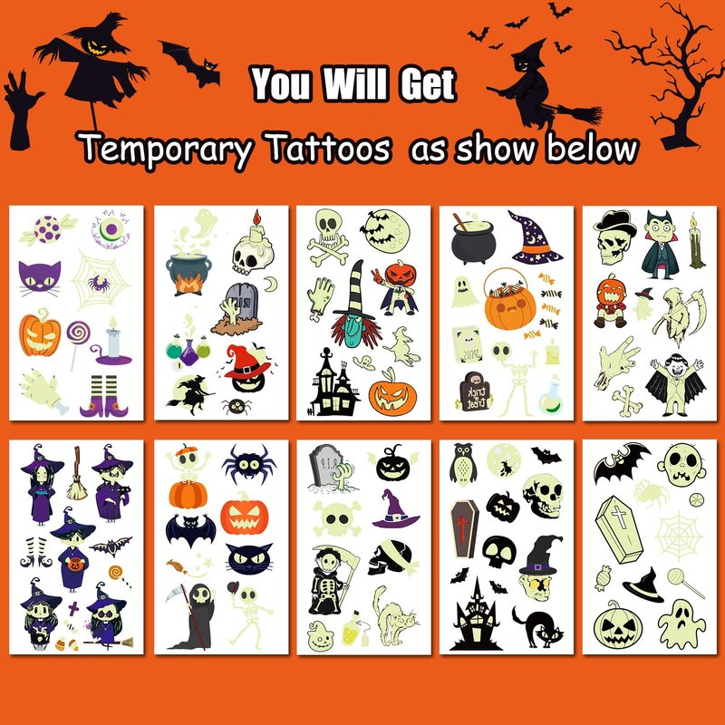 - Glow Halloween Temporary tattoos for kids: Temporary tattoos kids are glow in dark, bring more happiness and a fun festive atmosphere, great Halloween activities for kids. Note: leave the kids tattoos under light for a few minutes,then they will glow more well
