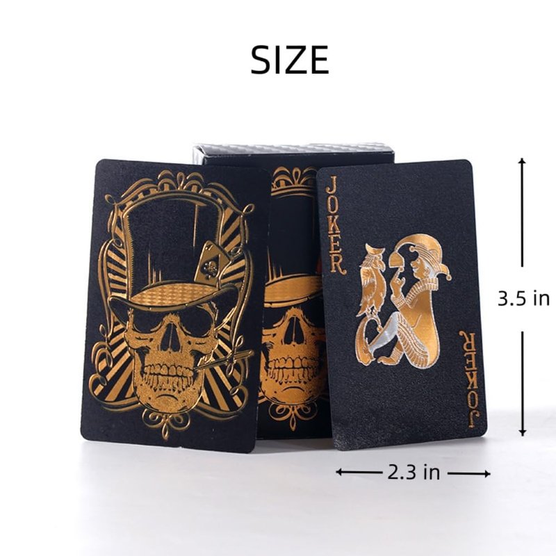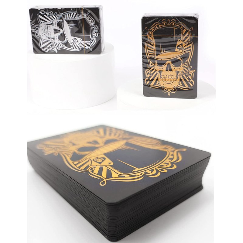 - 1.Black Foil Poker - Black playing cards,designed with Luxury skull background and pattern, gold and silver clear font, easy to read and recognize even in the poor sight. Unique COOL skull palying cards make game more funny and special.