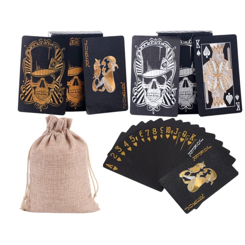 jcoral 2 Pack Skull Black Playing Cards Waterproof Poker Cards Plastic Black Foil Playing Cards Highly Flexible,2 Decks of Cards with Bag(Gold+Black 3)