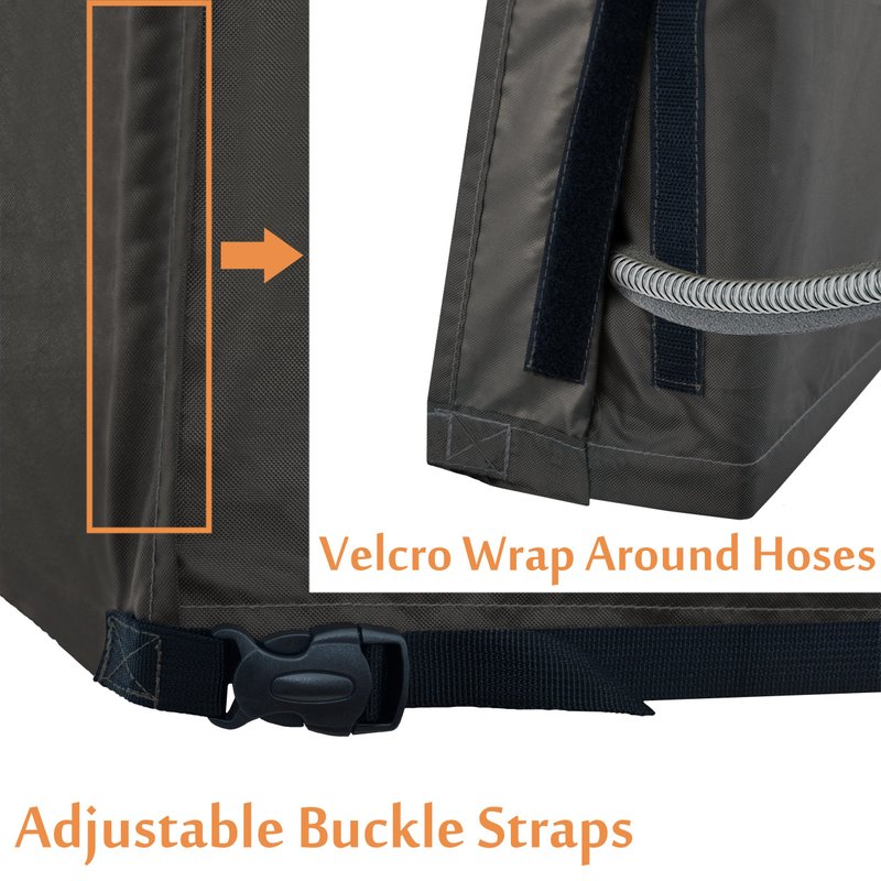 - Breezy Installation - A slit on the side allows the wiring and tubing go through, elastic hem cord around bottom, secure with side Velcro closure and Adjustable Buckle Straps for a snug fit on a windy day, easy fold to store.