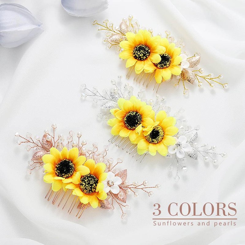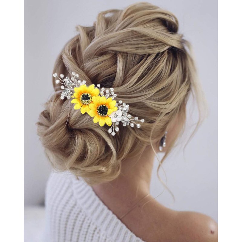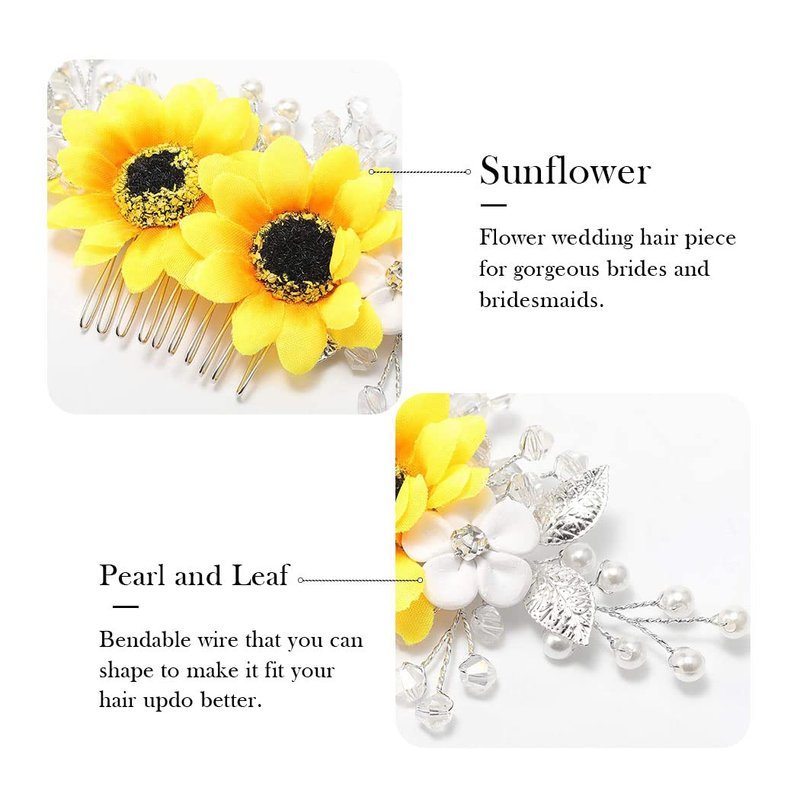 - Sunflower hair comb is made of alloy,sun-flowers,pearls,crystals and leaves.Colors:Silver.Simple yet elegant to decorate any updo on wedding day.