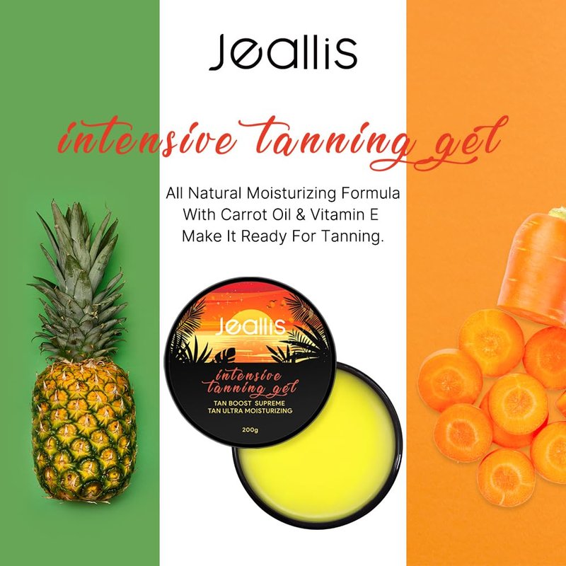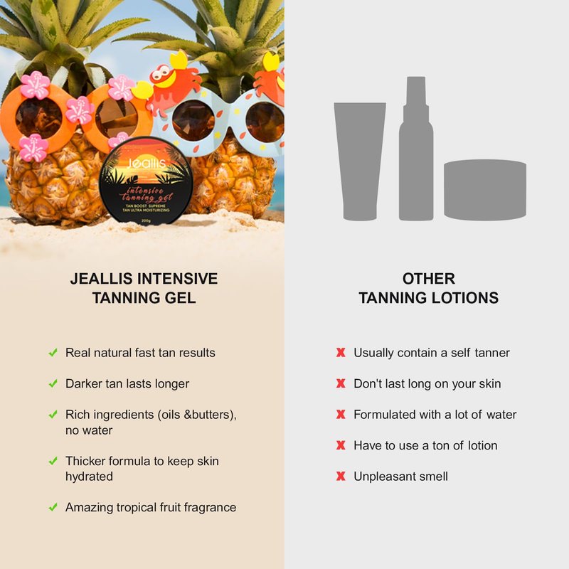 Jeallis intensive tanning luxe gel pineapple speeds up the tanning process and helps you achieve your natural, deeper, darker and long-lasting tanning results with less exposure to the sun or sunbed. This intensive tanning gel for outdoor sun has been committed to helping every babe be the best version of themselves with golden bronzed tan that means CONFIDENT, STUNNING, GORGEOUS! !