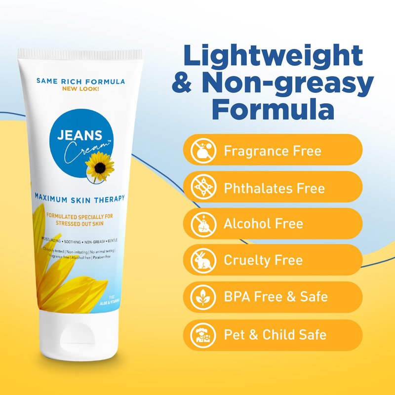 Jeans Cream, Maximum Skin Therapy Radiation Burn Cream, Moisturizing Vitamin E and Aloe Vera Cream for Compromised Skin, Minor Cuts, Sunburn and More, Non-Greasy Formula, 7 oz