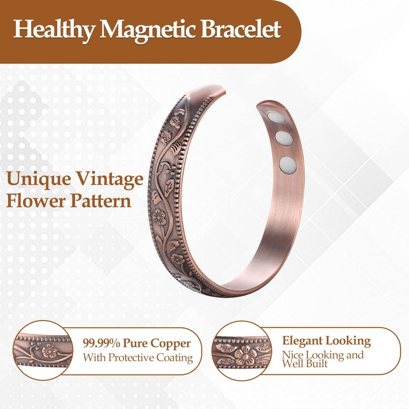 2Pcs Magnetic Copper Bracelets for Women, Vintage Flower 99.99% Pure Copper Bracelets with 3500 Gauss Magnets