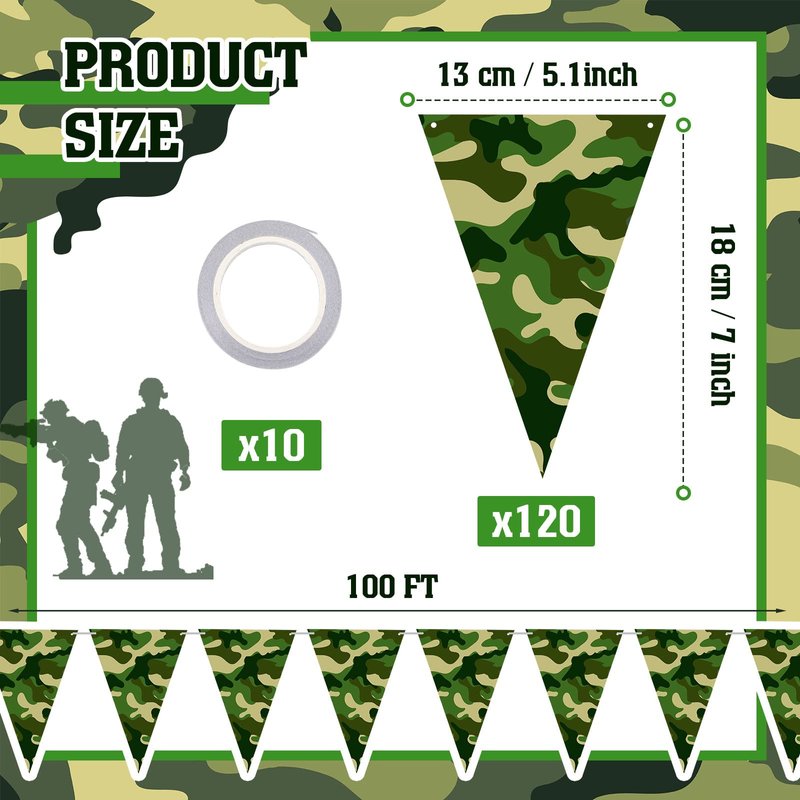 - What You Will Get: you will receive 120 pieces camo birthday party banners; Each string is about 3 meter/ 10 ft, and there are 10 rolls of strings, a total of 100 ft in total length; With these banner decorations, you can decorate anywhere you want; Classic and unique design can well decorate your camouflage birthday party
