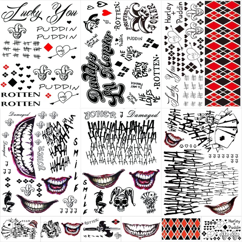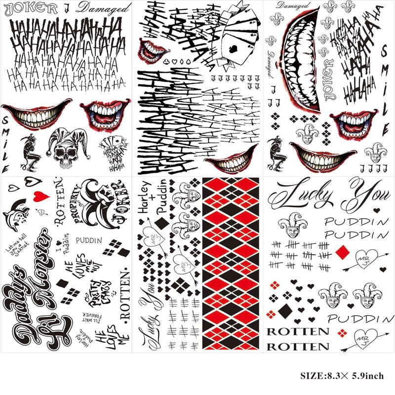 - ❥【MORE QUANTITY】 - 12 sheets Harley Quinn tattoos for Suicide Squad .Size: 6 sheets large Jaker tattoos size 8.3x5.9 inch, and 6 sheets small Harley Quinn tattoos size 4.1x2.4 inch. Much quantity Halloween tattoos for Suicide Squad Harley Quinn accessoriesare enough for you share it with your family and friends.