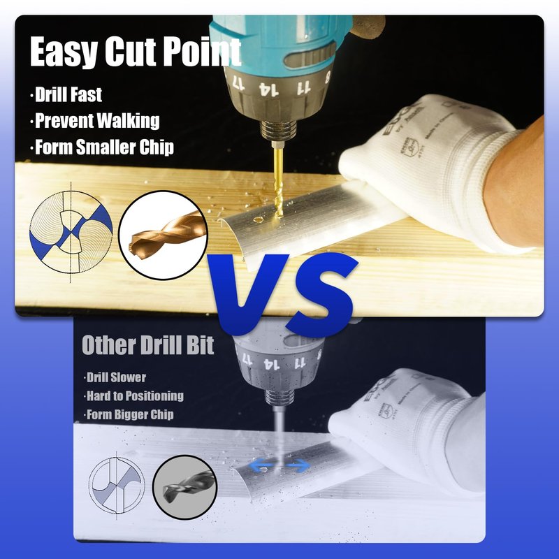 - Easy Cut Point - The 135° easy cut split point ensures a precision start, eliminates walking on the work surface which provides clean, accurate holes. No need for a center punch. More effective for drilling on curved surfaces.