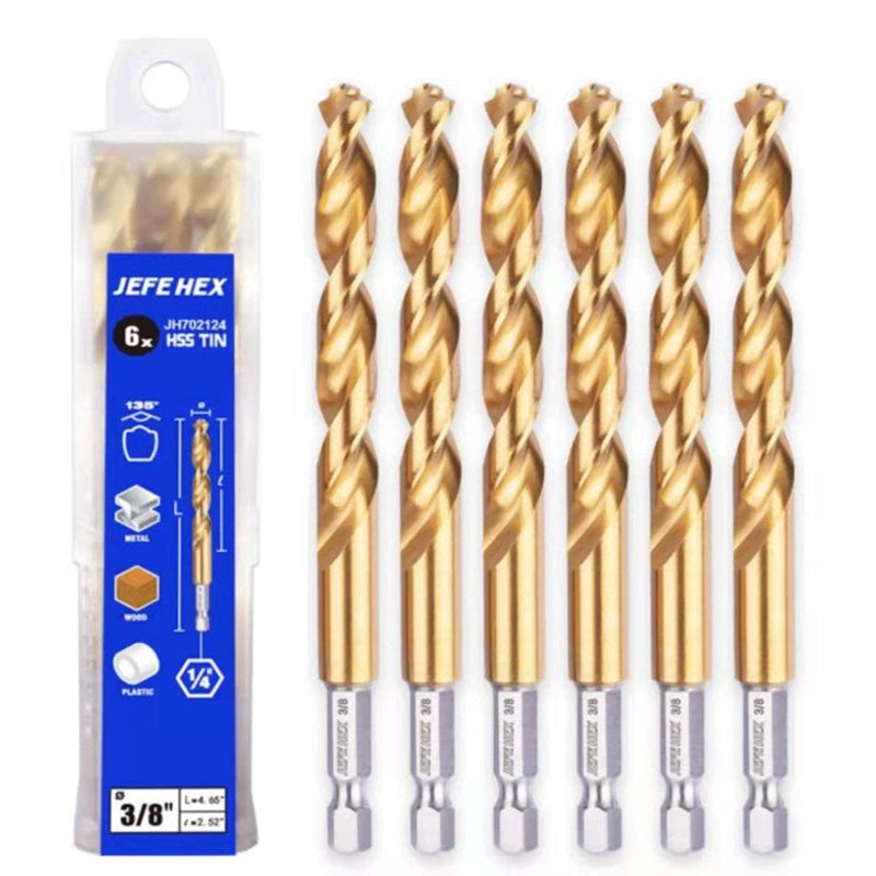 JEFE HEX 3/8" Inch Hex Shank with Titanium Coating Twist Drill Bits, 135 Degree Easy Cut Split Point Drill Bits (Pack of 6)