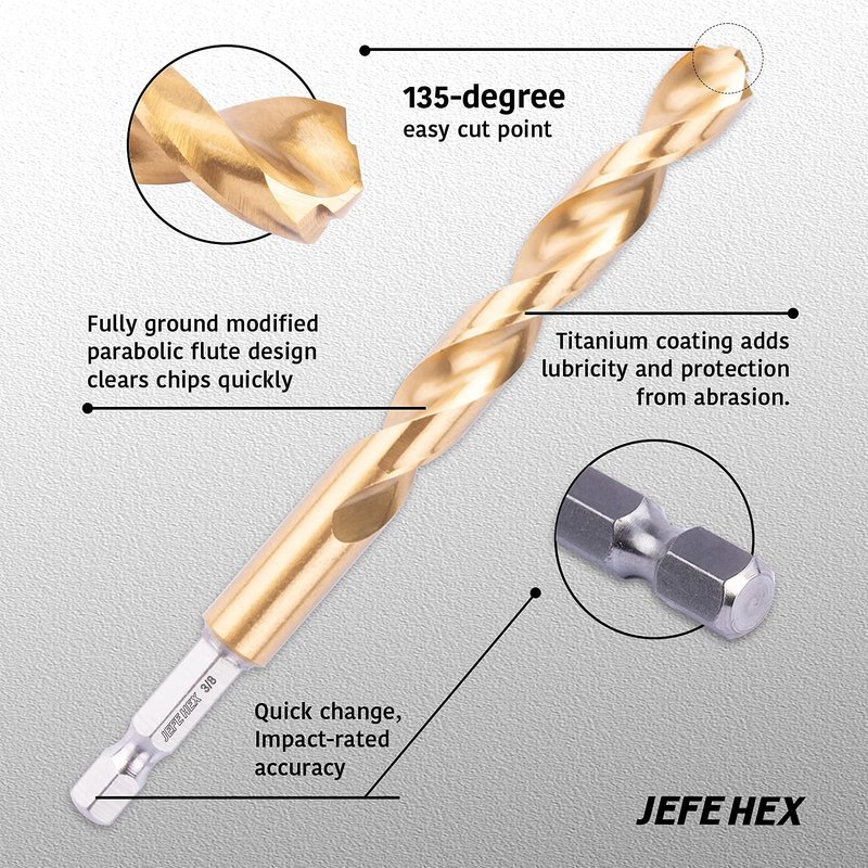 - Strength & Hardness - Tapered web enhances strength and durability. Titanium coating adds lubricity and protection from abrasion. Increases drill bit lifetime. Jefe Hex drill bit with enhanced parabolic flutes promotes chip removal which decreases friction and heat. The tapered web adds strength.