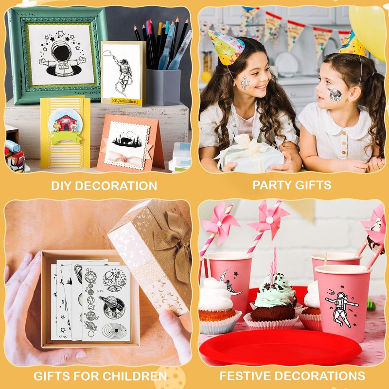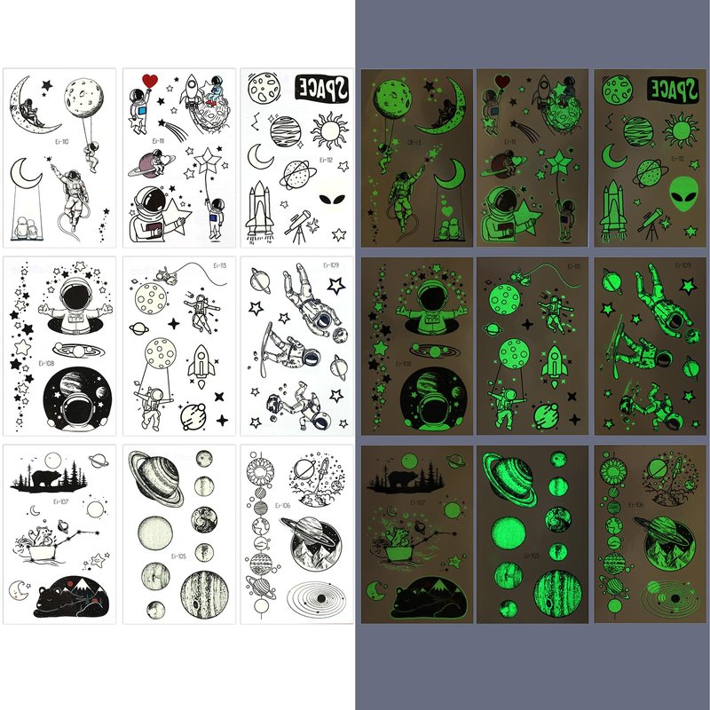 - 【Space-Themed Tattoos】Let your child's imagination fly high with our space-themed tattoos. They can sport adorable planets, rockets, stars, and more on their skin, all adding to the fun.