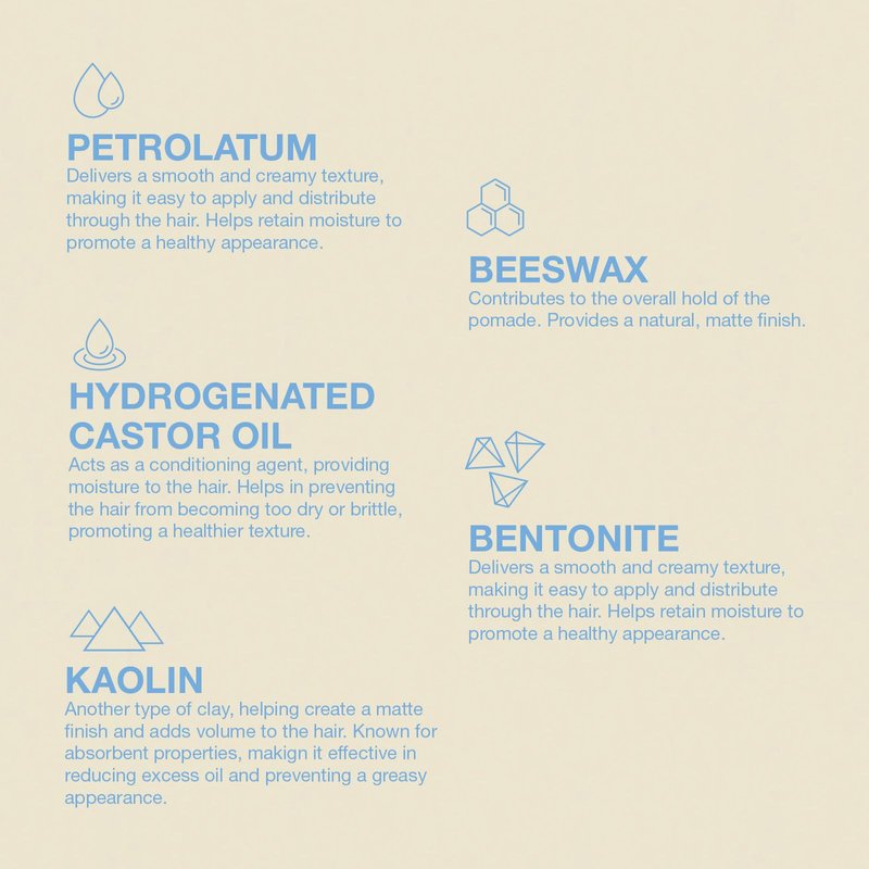 - Smooth Texture - Our clay pomade formula has the perfect balance of natural beeswax and castor oil, two active ingredients that work in harmony to deliver a smooth consistency that is easy to apply and allows for even distribution on your hair.