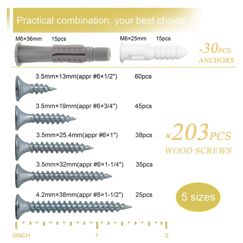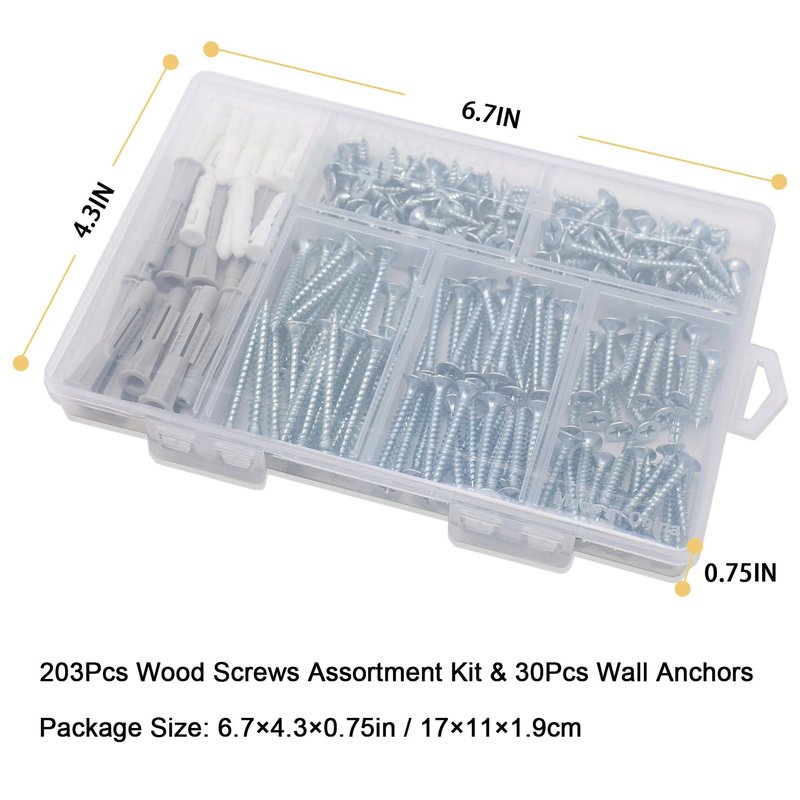 【Total: 203 Pieces 5 Sizes Wood Screws Assortment Kit】