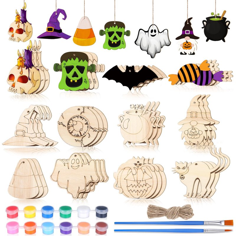 - What You Get: 36 sets of blank unfinished slices of wooden shapes, of which 12 different shapes and sizes for Halloween, 3 pieces per style, including bats, candy Corn, Skull, ghost. Each piece of wood is drilled and comes with two brushes, paint and twine, to power kids artistic endeavors without worrying about running out of supplies soon, ensuring kid never run out of creative possibilities.
