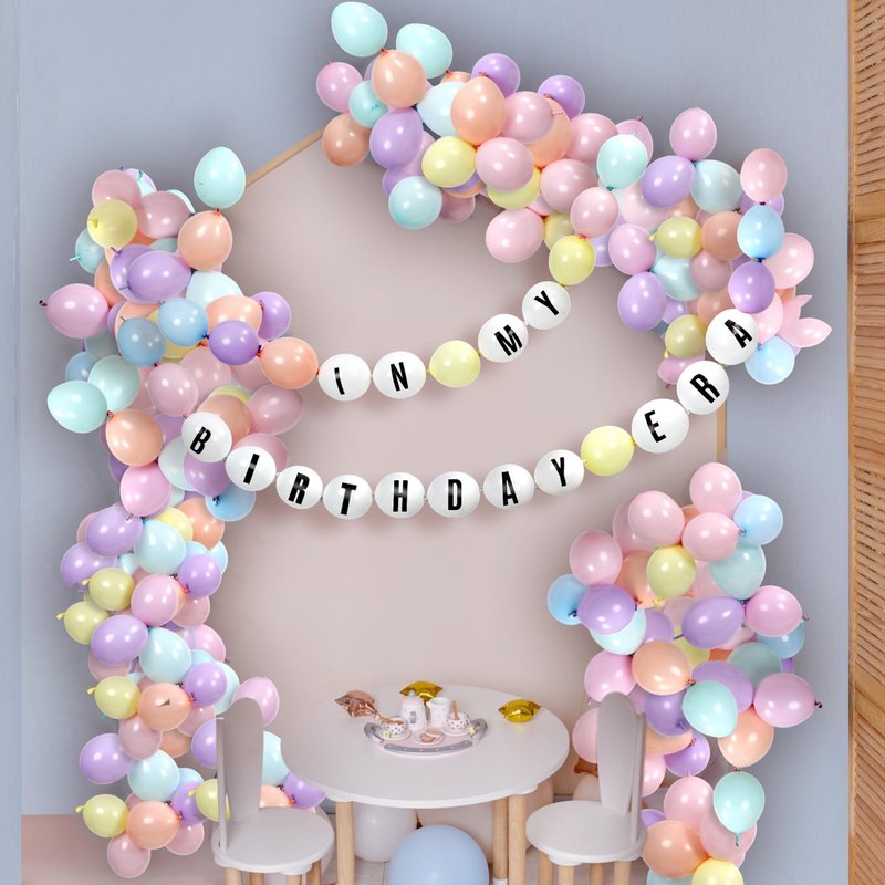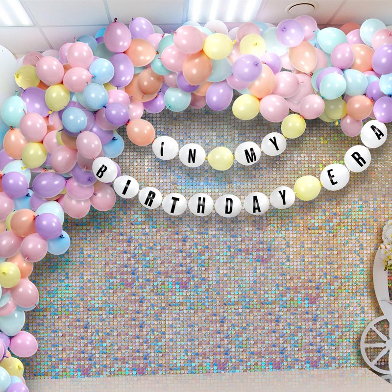 JellyArch Birthday Era Decoration DIY Giant Friendship Bracelet Balloon Kit 70 Link Balloons Tail Connected Balloon Garland 4 Letter Number Stickers for Customizable Birthday Banner Party Supplies
