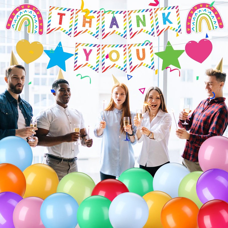 - Materials and Size: the thank you balloon banner decoration is made of paper, sturdy and reusable, circle balloons are made of natural latex, thick and strong, the thank you banners for employees letter height of each is about 6.69 x 7.68 inches, colorful balloons are 12 inch and rainbow balloon is 21.65 x 30.31 inches