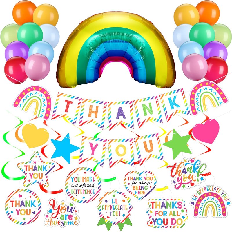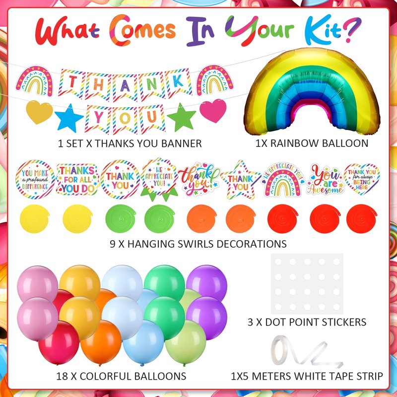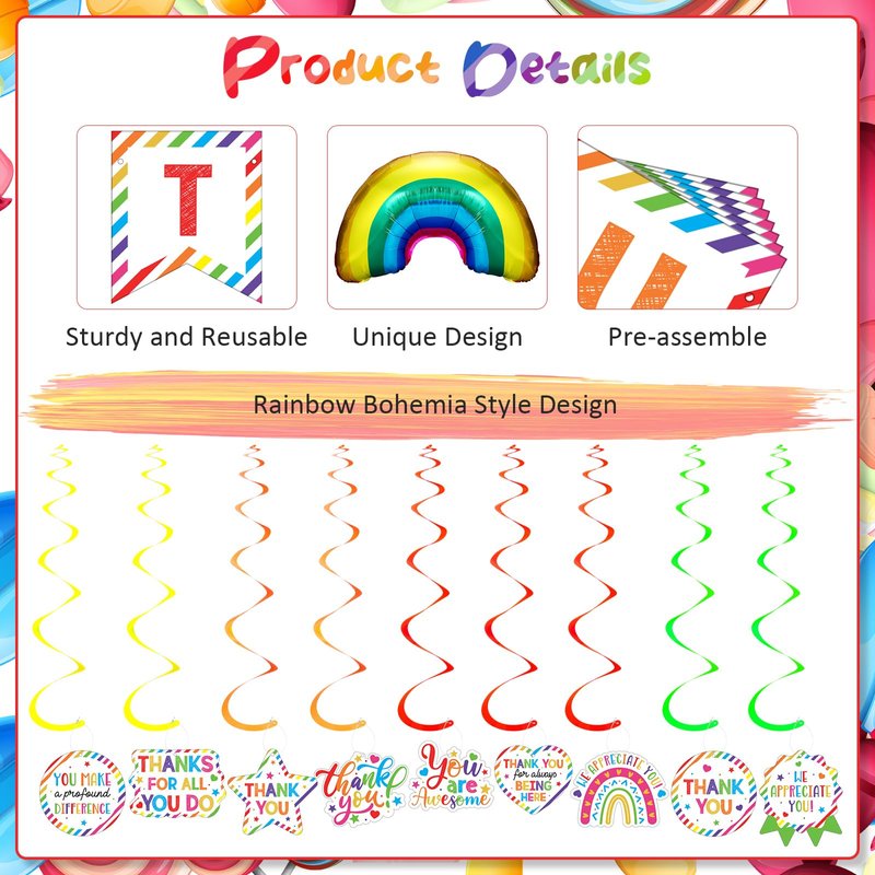 - Package Includes: the rainbow theme appreciate decoration kit of 30 pcs includes 1 set of thank you banners, 9 pieces of different types hanging swirls decorations printed with [thanks for all you do], [thank you] respectively and 4 colors ribbon(red, green, orange, yellow) 18 pieces of colorful balloons in 9 different colors, 1 piece of rainbow balloon, 1 roll of 5 meters white tape strip and 3 pieces of stickers, which can let you use easily and conveniently