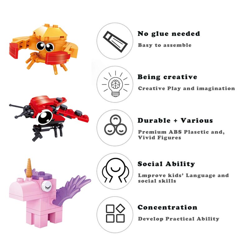 - ❤ 12 in 1 Building Animals Set- This item include 12 animals mini blocks pack,Elephant Unicorn Crocodile Whale Deer Bird Crab Ladybug Snake Duck Hippo Octopus,each around 20-30 pcs blocks,very easy to set up ,your kids can learn different animals by set up by themself. Gift color box packaged,pretty gift suitable for kids ages 6 +.