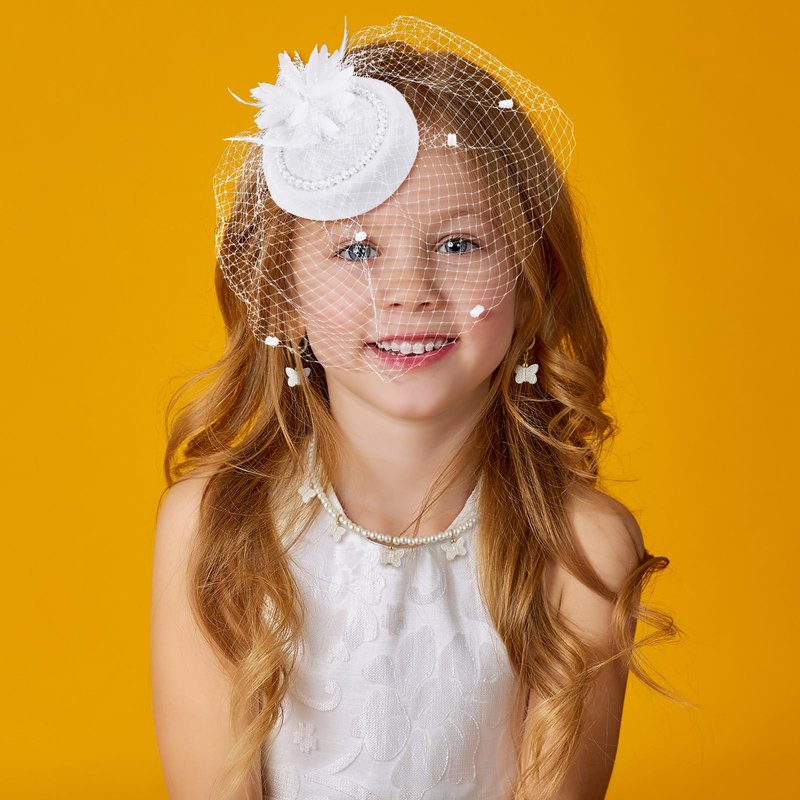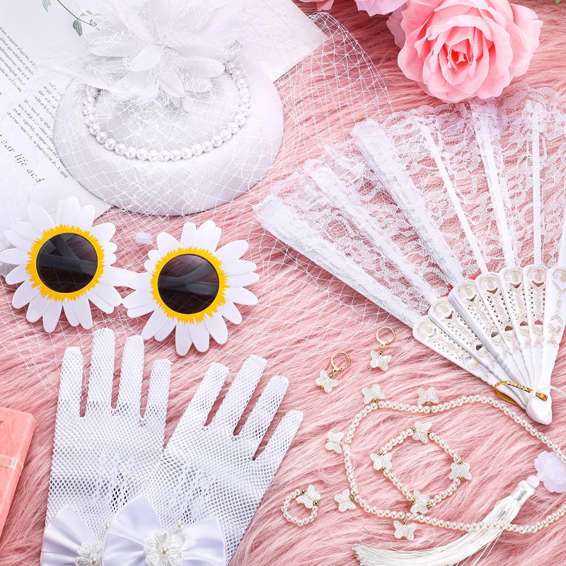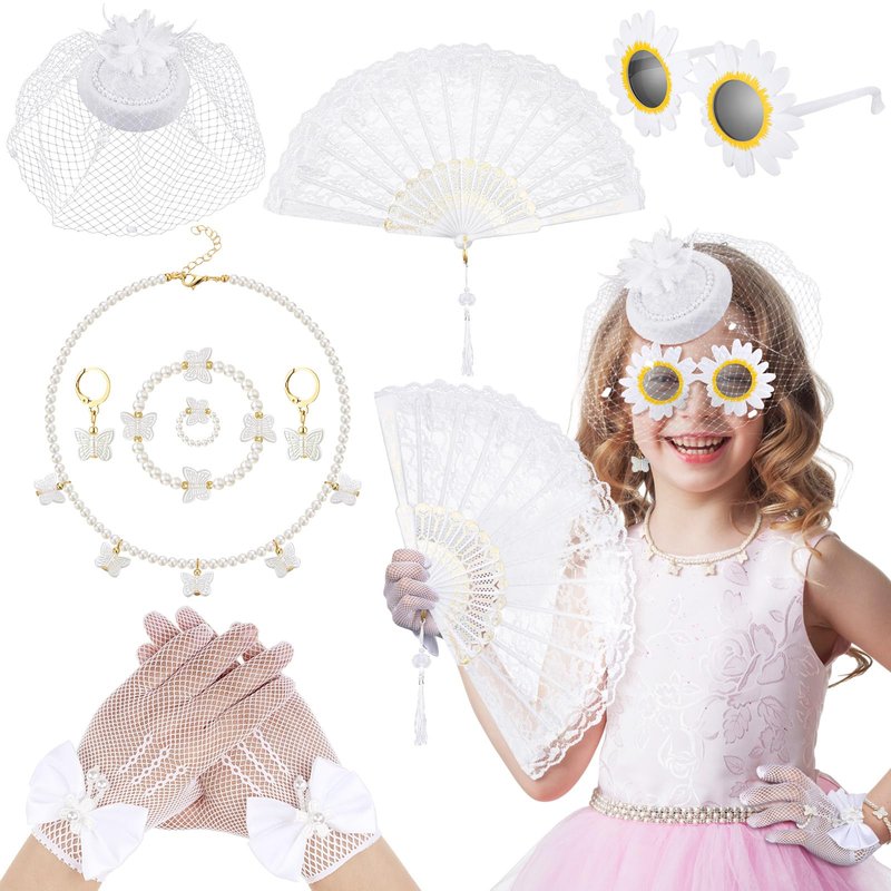 Jenaai 8 Pcs Girls Tea Party Supplies Tea Party Gloves Hats Necklace Fan for Girls Halloween Tea Party Costume(White,Fresh)