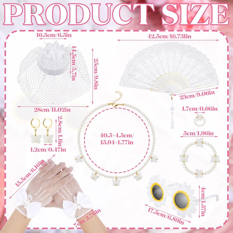 - Girls Tea Party Set: the package contains a total of 8 pieces of tea party supplies, including 1 pink children's tea party hat, 1 pair of pink gloves, 1 pink lace fan, 1 pair of pink glasses, 1 necklace with pink bow, 1 pink bow bracelet, 1 pair of pink bow ear clips and 1 pink bow ring; The rich combination are enough to satisfy your tea party decoration needs