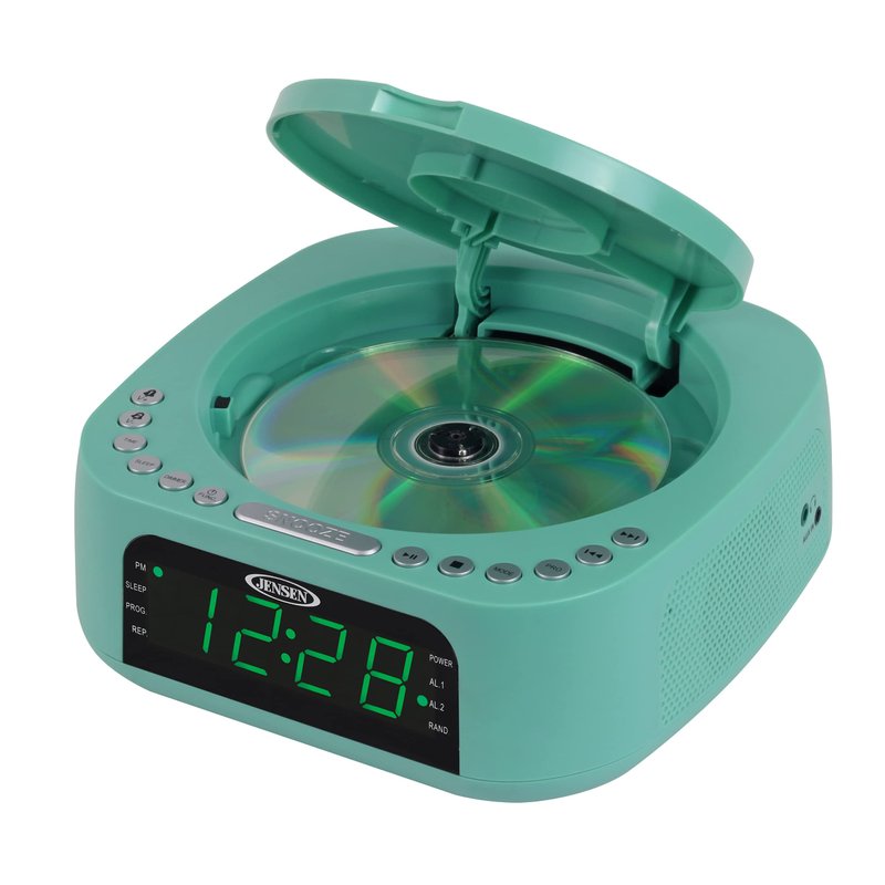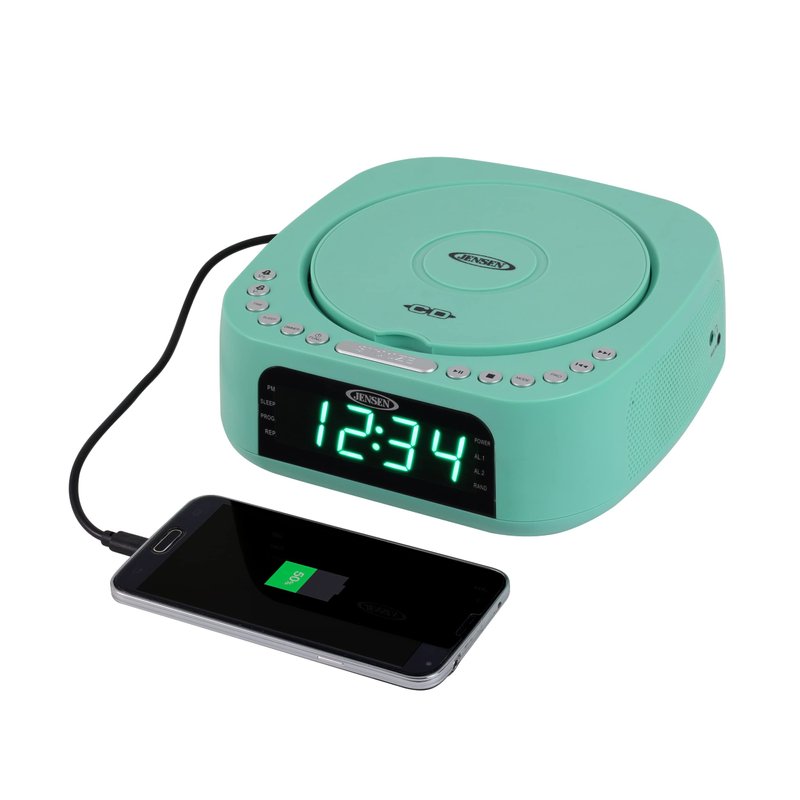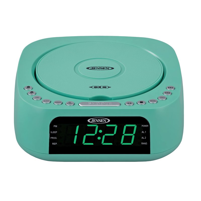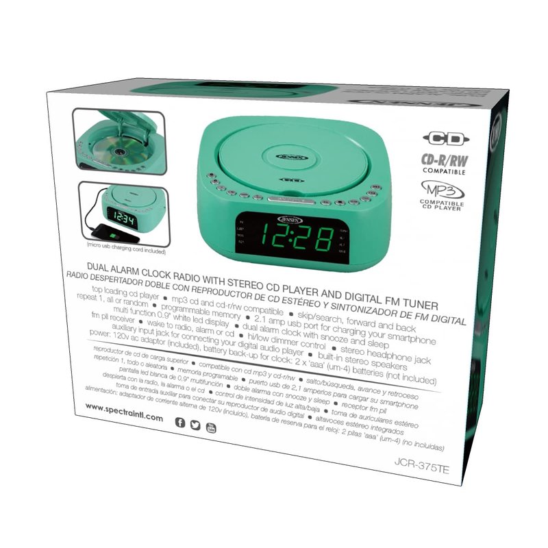 The JENSEN JCR-375TE Teal Limited Edition Stereo Digital Dual Alarm Clock Radio with CD Player is the perfect all-in-one device for your nightstand or anywhere in the house. The top-loading CD player provides versatile playback options, and plays both store bought or custom recorded CD-R/CD-RW discs, including those with MP3 music files. The unit also features a digital FM radio that can store up to 20 FM presets for easy access, a bright and easy to read Green LED display, an auxiliary input for connecting a digital audio player and a headphone jack for private listening. The dual alarm clock radio includes sleep and snooze functions and has the ability to wake you to radio, CD, or alarm. Also included is a 2.1A USB port for charging your smartphone. The unit operates on 120V AC power and includes a battery backup for the clock settings.
