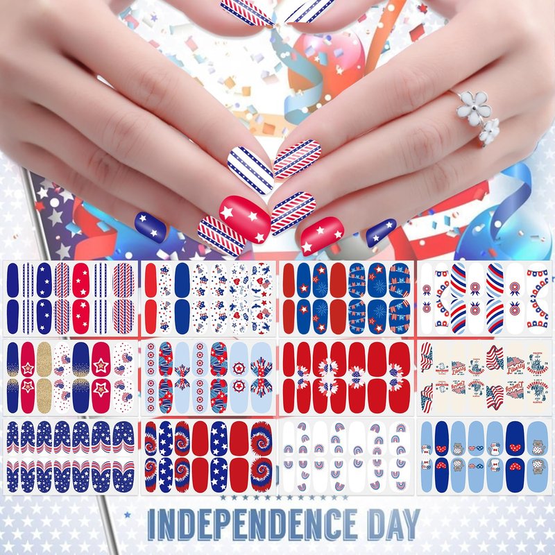 - 🇺🇸【Simple to Operate】:The colorful Independence Day nail wraps are self-adhesive and convenient to use, just choose the patterns you like and paste them on your nails, then apply a layer of nail polish to fix them, you can also match them with a colored base coat or combine different patterns together.