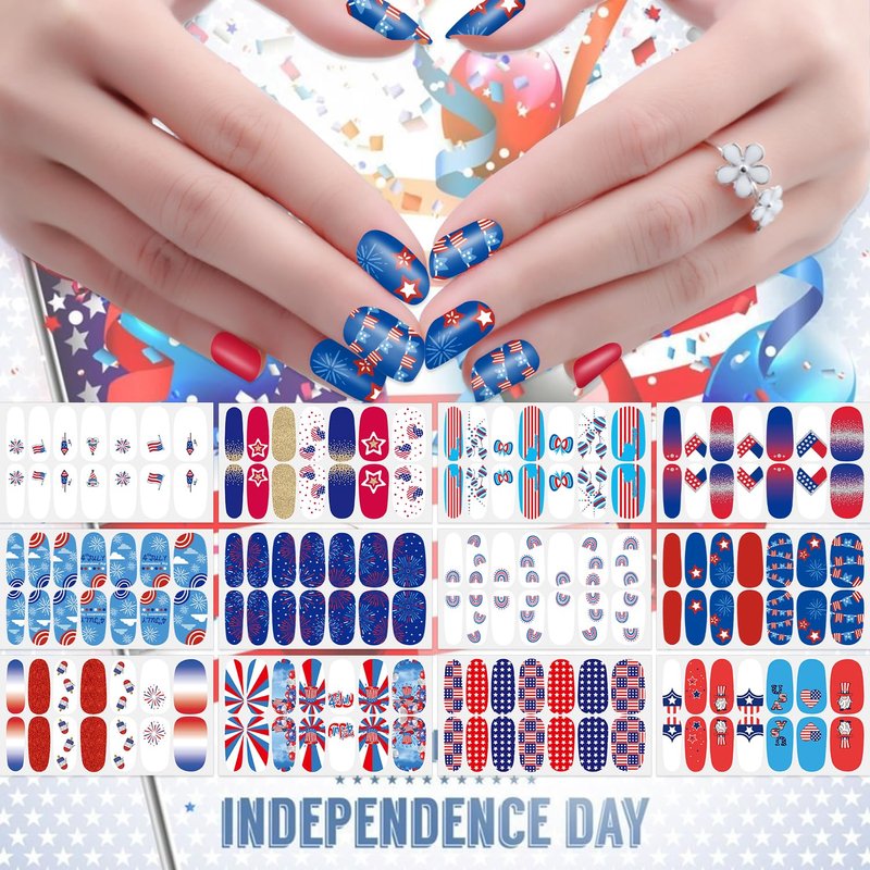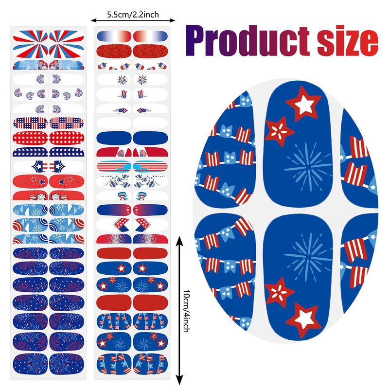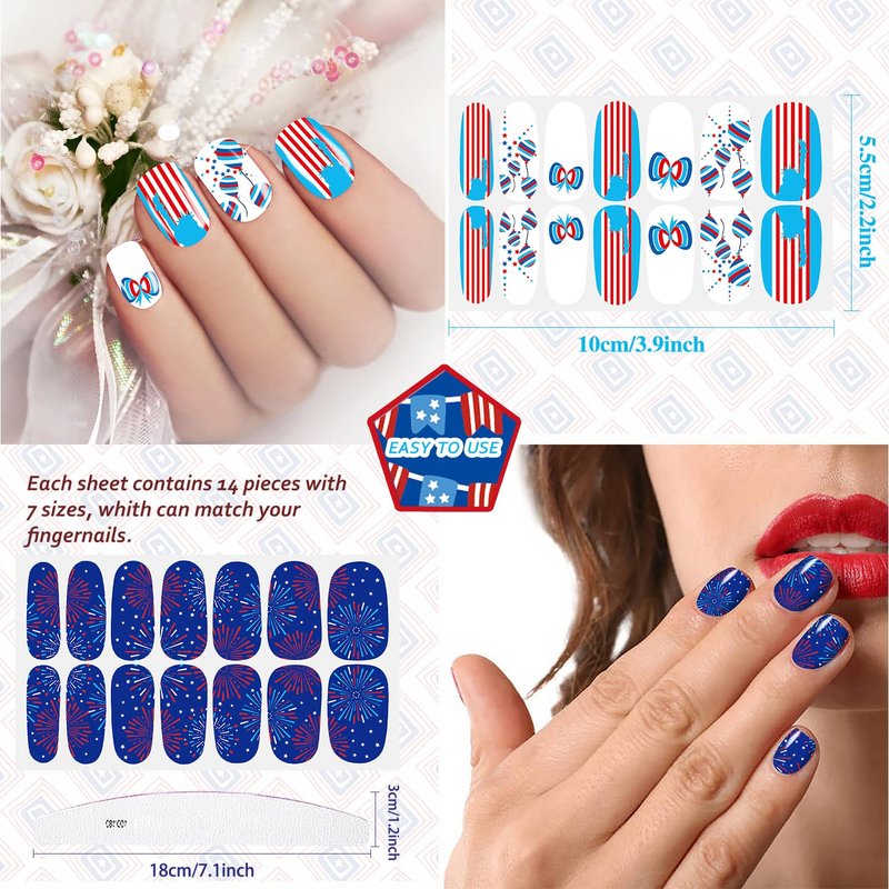 - 🇺🇸【Simple to Operate】:The colorful Independence Day nail wraps are self-adhesive and convenient to use, just choose the patterns you like and paste them on your nails, then apply a layer of nail polish to fix them, you can also match them with a colored base coat or combine different patterns together.