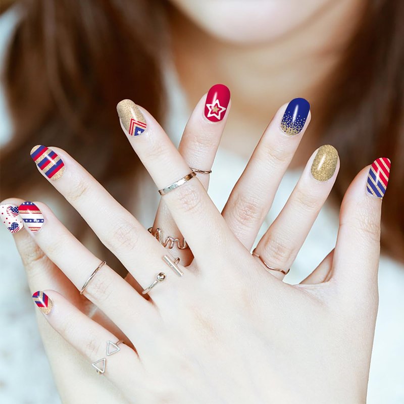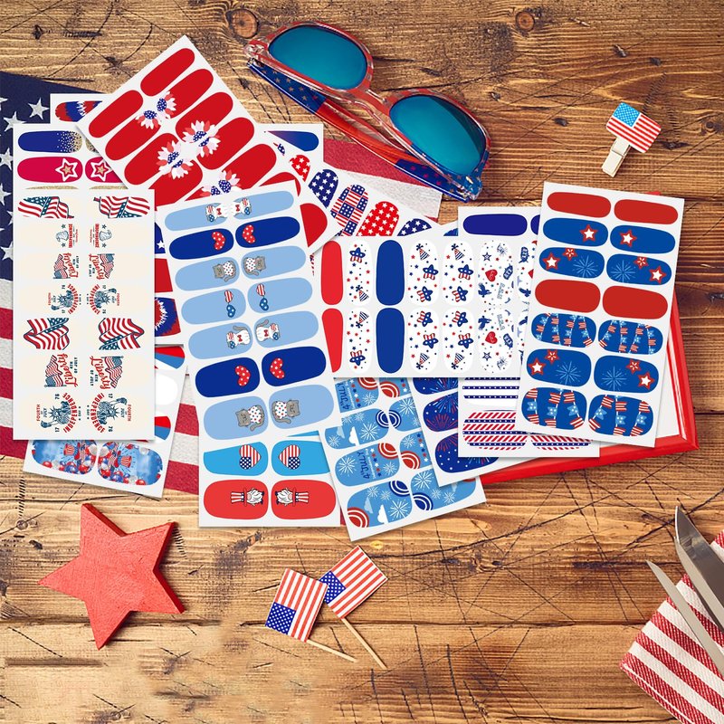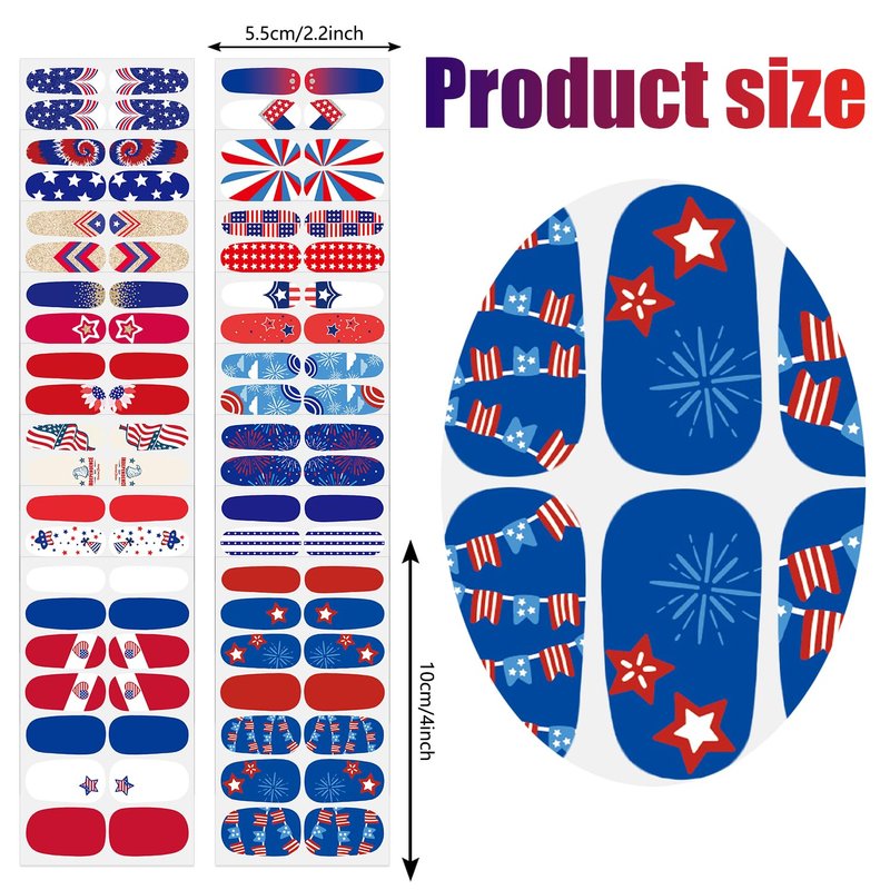 - 🇺🇸【Simple to Operate】:The colorful Independence Day nail wraps are self-adhesive and convenient to use, just choose the patterns you like and paste them on your nails, then apply a layer of nail polish to fix them, you can also match them with a colored base coat or combine different patterns together.