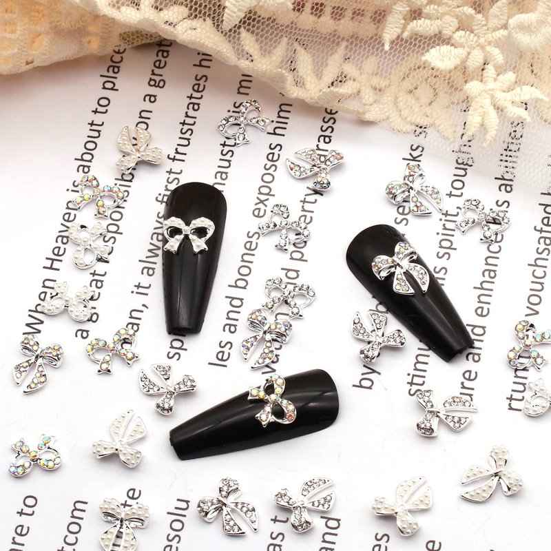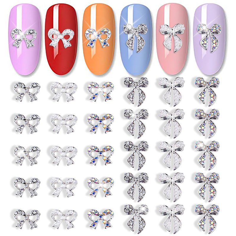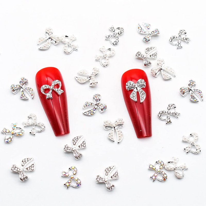 - 🎀【Package Content】: 30 pieces silver bow nail charms. It contains 2 styles, and each style has 3 types (iridescent diamond, clear diamond and pearl). Multiple choice, gives you different nail design every time.