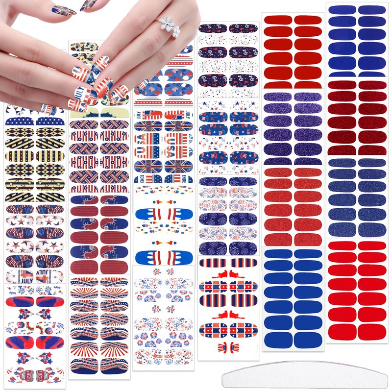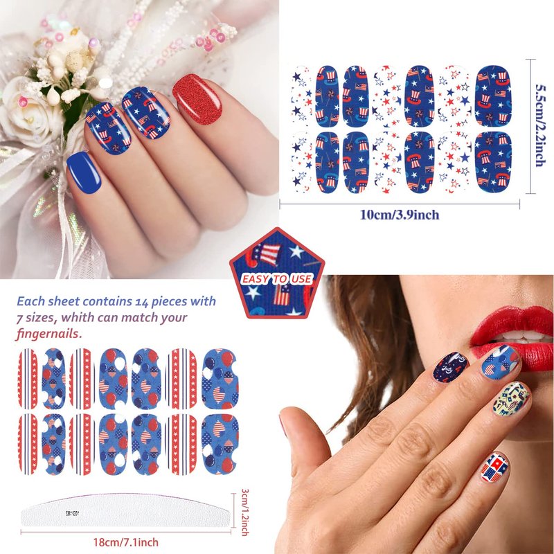 - 🇺🇸【Simple to Operate】:The colorful Independence Day nail wraps are self-adhesive and convenient to use, just choose the patterns you like and paste them on your nails, then apply a layer of nail polish to fix them, you can also match them with a colored base coat or combine different patterns together.