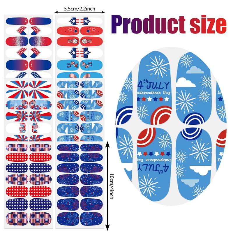 - 【Easy to Use】:These colorful Independence Day nail wraps are self-adhesive and easy to use, just choose the patterns you like and paste them on your nails, then apply a layer of nail polish to fix them, you can also match them with a colored base coat or combine different patterns together.