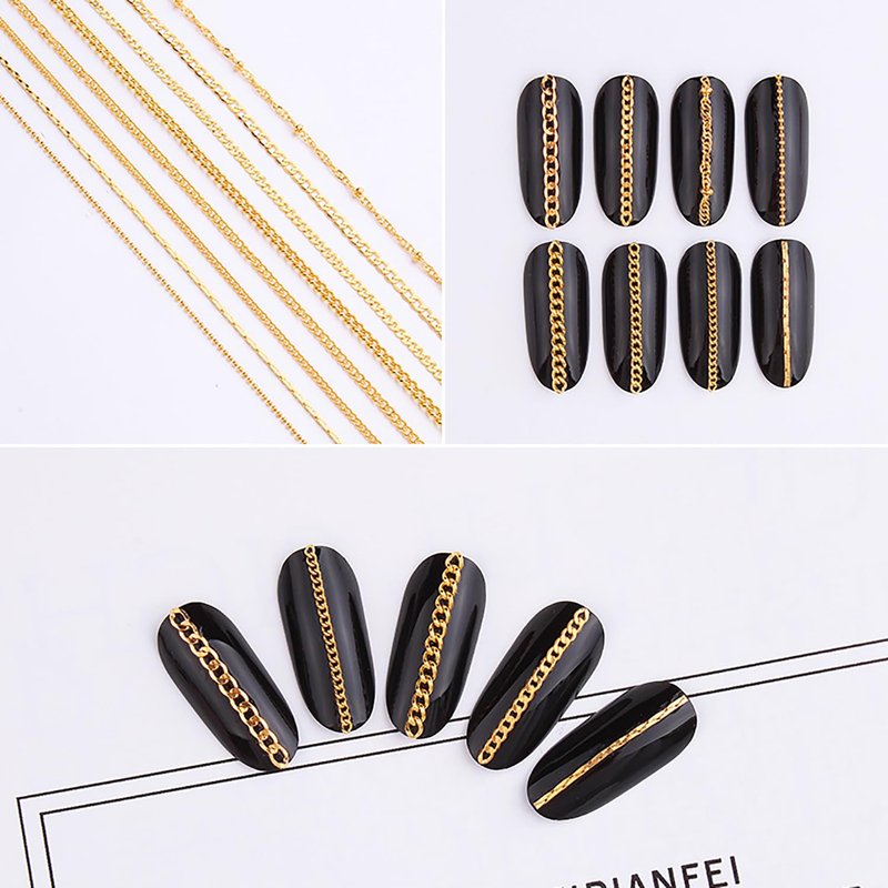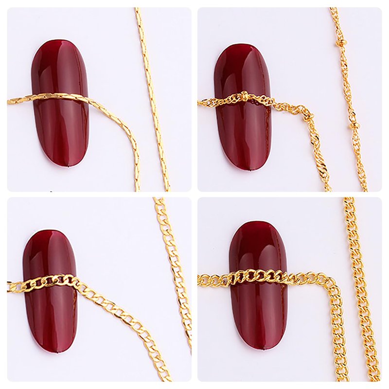 - 【8 Strips Gold Nail Chains】: You will receive 8 strips metallic gold nail chains, each style comes in a separate packaging bag for your convenience. The length of each metal chain is 19.7in, and the width ranges from 0.039in to 0.098in. Different styles can meet your different DIY needs to enjoy the fun of nail art.